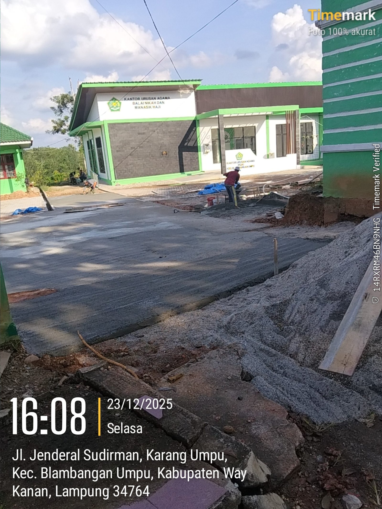 Kementerian Agama (Kemenag) Kabupaten Way Kanan, Lampung, melalui Kepala Subbagian Tata Usaha (Kasubbag TU) Joko Susanto, saat dikonfirmasi awak media melalui saluran WhatsApp (WA), mangatakan bahwa pengerjaan paving atau pelataran parkir tersebut merupakan satu paket dengan pembangunan gedung KUA Blambangan Umpu.